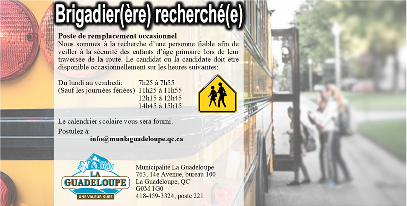 La Municipalité de La Guadeloupe est à la recherche d'un personne qualifiée pour combler le poste de brigadier(ère) scolaire de façon occasionnelle. Pour infos consultez la page suivante: https://www.munlaguadeloupe.qc.ca/pages/nos-offres-demploi