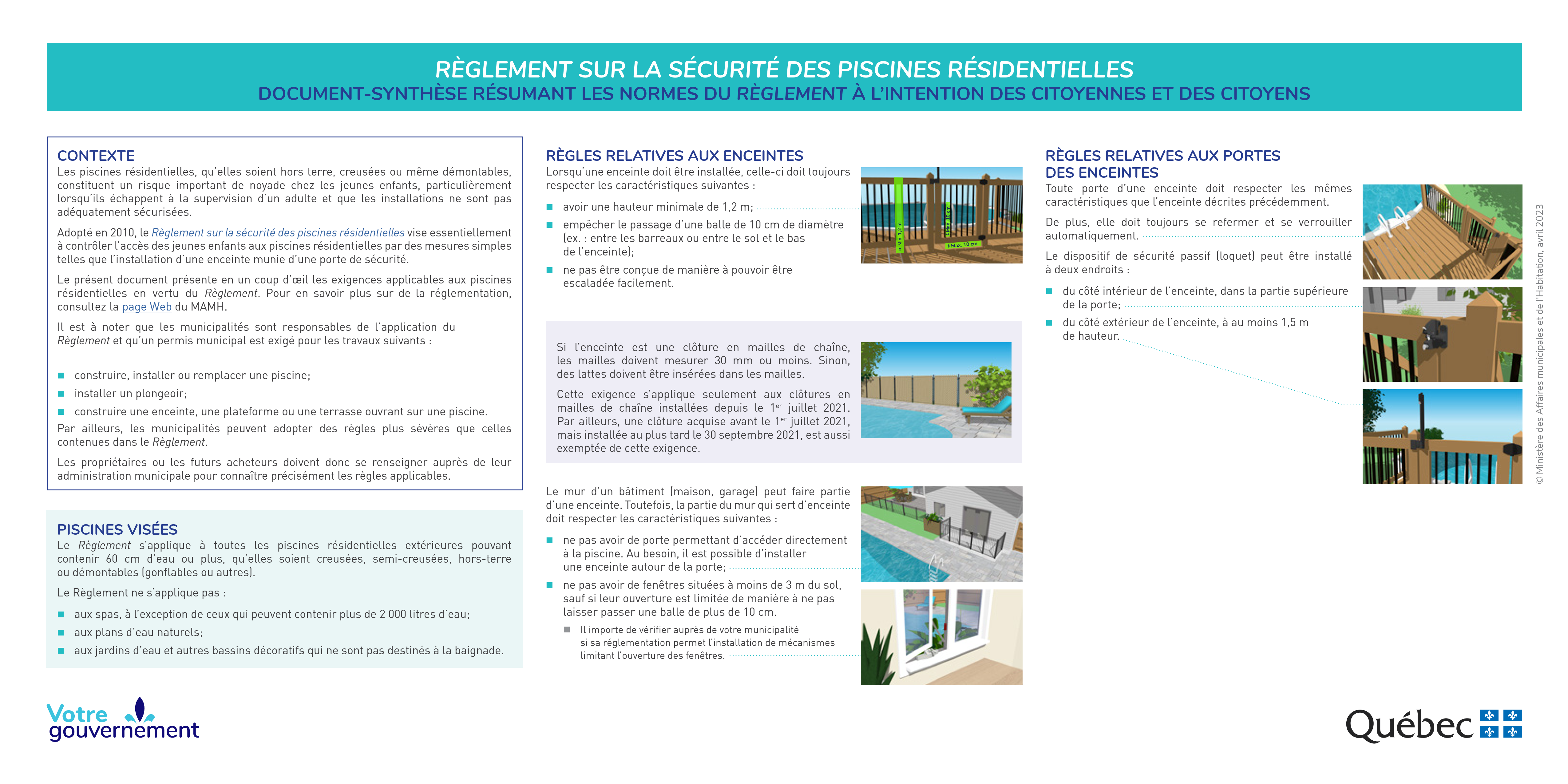 Pour prévenir les noyades, surtout chez les jeunes enfants, toutes les piscines résidentielles extérieures capables de contenir 60 cm d’eau ou plus doivent respecter le règlement provincial. Vous avez jusqu’au 30 septembre 2025 pour vous y conformer. Afin de vérifier la conformité de vos installations, des formulaires d'auto-évaluations sont disponibles :