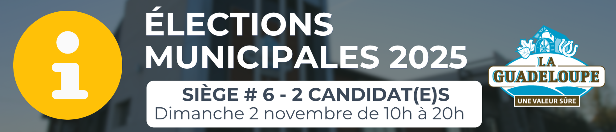 La période de mise en candidature s’est terminée le 3 octobre à 16 h 30. Cinq des six postes de conseillers ainsi que le poste de maire ont été pourvus sans opposition. Nous félicitons les personnes élues pour leur engagement envers La Guadeloupe :